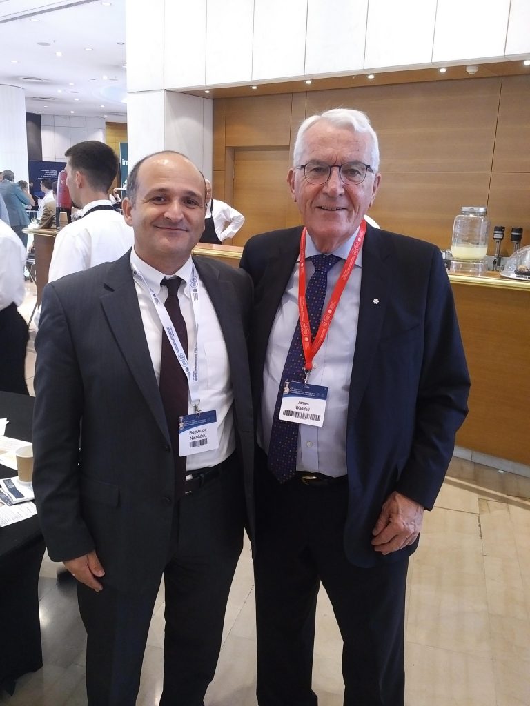 Συνάντηση με τον Καθηγητή James Waddell σε ένα διάλειμμα των εργασιών του 75ου Πανελληνίου Ορθοπαιδικού συνεδρίου. Ο Βασίλειος Νικολάου υπήρξε ο πρώτος Έλληνας fellow στο πανεπιστημιακό νοσοκομείο St Michael’s του Τορόντο, υπό την επίβλεψη του καθ. Waddell περίπου δέκα έτη πριν.